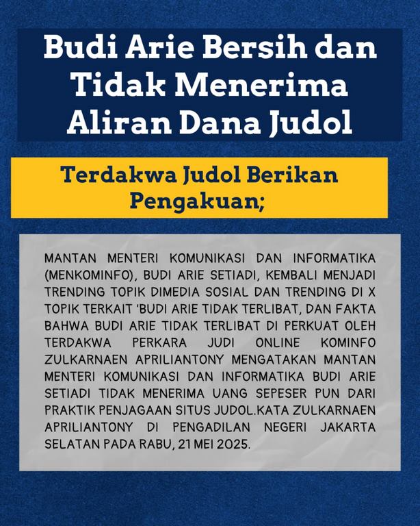 JAKARTA | Mantan Menteri Komunikasi dan Informatika (Menkominfo), Budi Arie Setiadi, kembali menjadi topik trending di media sosial, khususnya di platform X. Topik ini mencuat setelah muncul pengakuan dari terdakwa kasus judi online yang menyebut bahwa Budi Arie tidak terlibat dalam praktik tersebut.