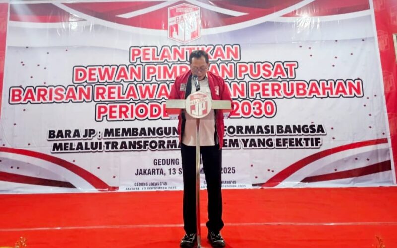 Suaraperubahan.web.id JAKARTA – Suasana Gedung Juang ’45 Menteng, Jakarta, bergemuruh ketika Dewan Pimpinan Pusat Barisan Relawan Jalan Perubahan (Bara JP) resmi dilantik untuk periode 2025–2030. Acara bersejarah ini menjadi magnet perhatian publik, akademisi, hingga tokoh politik nasional, karena diyakini akan menjadi momentum baru dalam konsolidasi relawan pengawal demokrasi dan pembangunan bangsa.