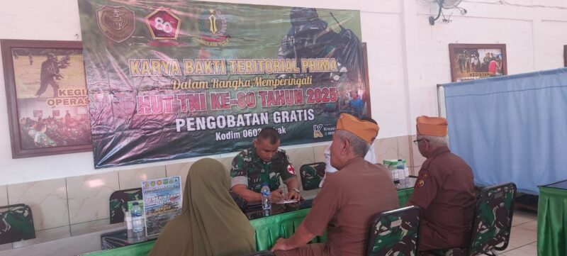 LEBAK – Dalam rangka memperingati Hari Ulang Tahun (HUT) ke-80 Tentara Nasional Indonesia (TNI), Kodim 0603/Lebak menggelar kegiatan Bakti Teritorial Prima berupa donor darah, pengobatan gratis, serta pembagian paket sembako.